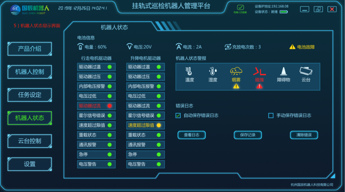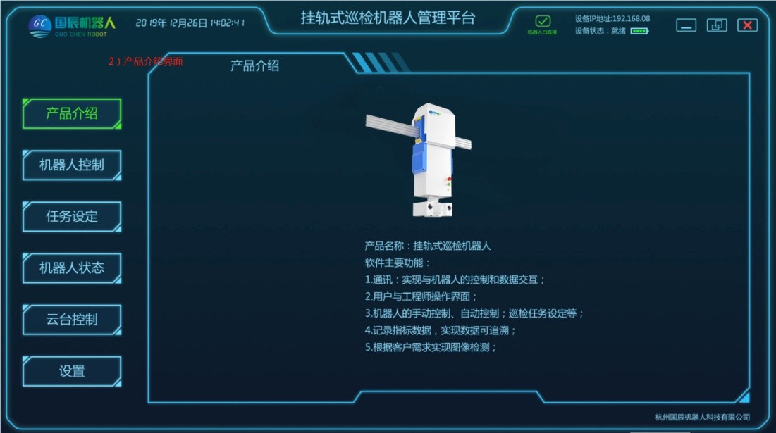 項(xiàng)目主要由移動機(jī)器人本體、軌道系統(tǒng)、采集設(shè)備、定位系統(tǒng)、供電和通信系統(tǒng)、后臺系統(tǒng)等結(jié)構(gòu)組成。在巡檢工作過程中,由用戶設(shè)定任務(wù)點(diǎn),加裝采集設(shè)備,移動機(jī)器人根據(jù)控制指令在軌道上運(yùn)動,將采集設(shè)備運(yùn)送到指定位置采集數(shù)據(jù),且滿足所需要的負(fù)載量,速度;在機(jī)器人行駛過程中可實(shí)現(xiàn)自主爬坡、采集設(shè)備可根據(jù)監(jiān)測物體高度進(jìn)行升降調(diào)整等功能;配套的調(diào)試軟件支持手動、控制移動平臺運(yùn)動;具有較強(qiáng)的適用性及拓展性,可自定義模塊搭配,自主設(shè)定任務(wù)點(diǎn),自動巡檢、定點(diǎn)采集、自動充電等功能。